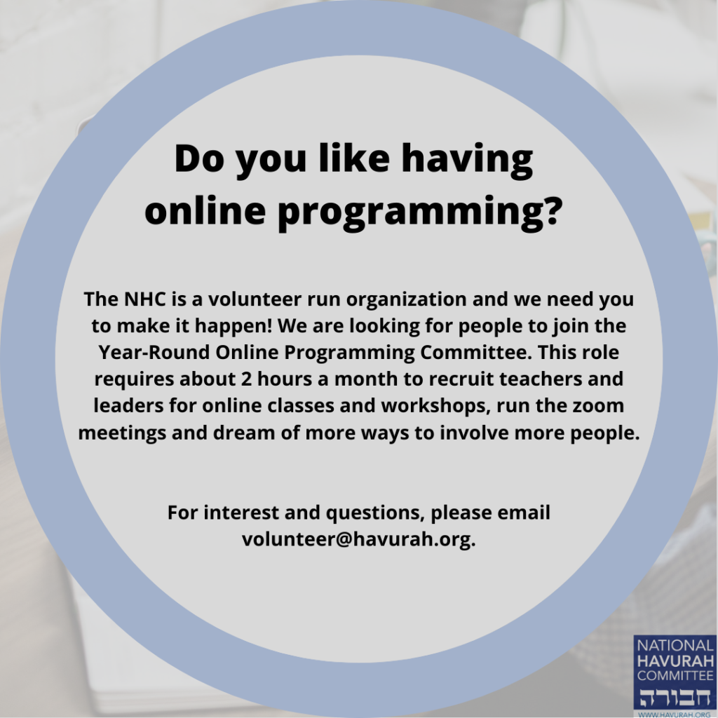 Register here to get the Zoom link. Contact neillitt@outlook.com to volunteer to offer a five-minute drash on your favorite sugya.
